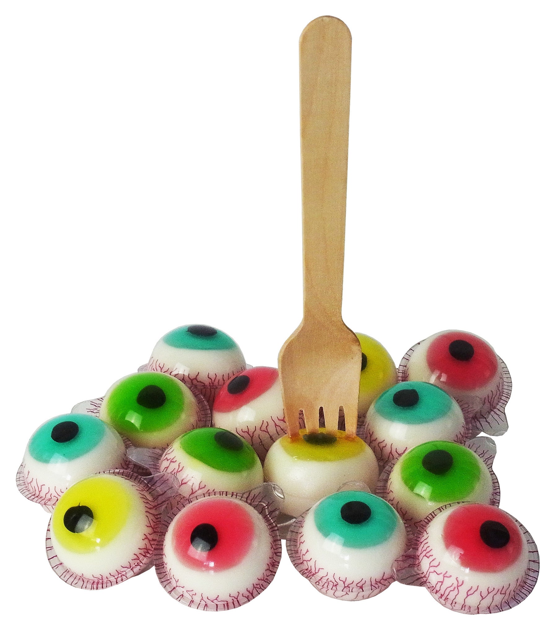 - es handelt sich bei den Augen um ein Schaumzucker Gummibonbon mit fruchtiger Füllung, die fruchtige Füllung kommt besonders dann eindrucksvoll zur Geltung, wen man ein Auge mit der Gabel aufspießt - Augen sehen "echten" Augen sehr ähnlich!