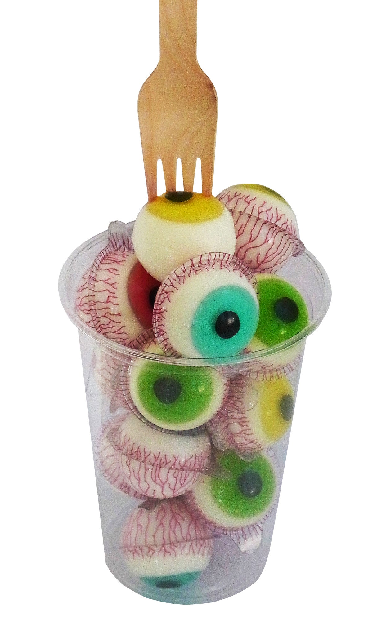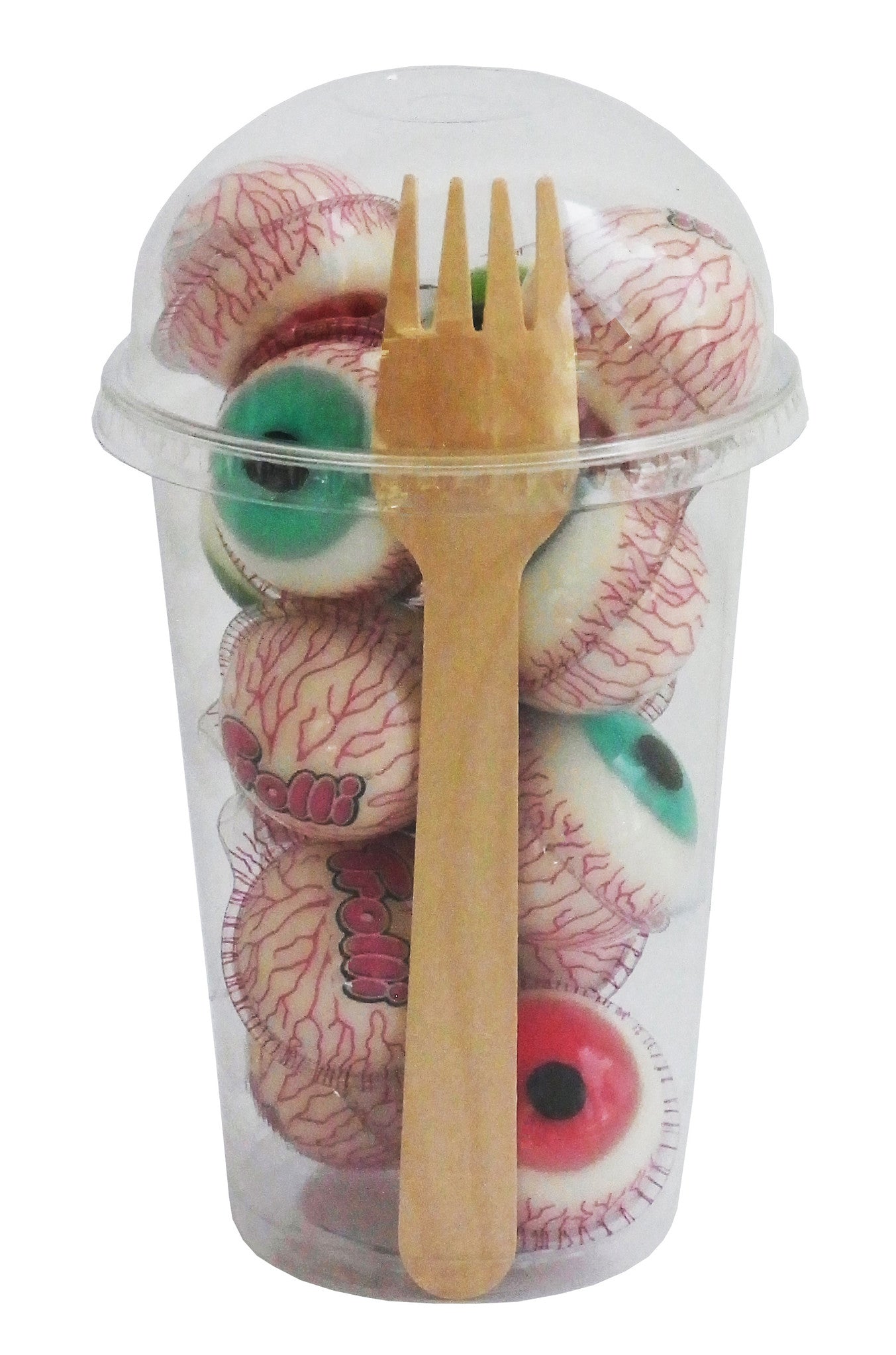 - insgesamt sind im Becher 14 Augen (14 x 18,8g, knapp 3 cm Durchmesser je Auge) enthalten, jedes Auge ist einzeln verpackt, eine praktische Gabel aus Holz um die Augen bei Bedarf aufspießen zu können liegt dem Becher bereits bei
