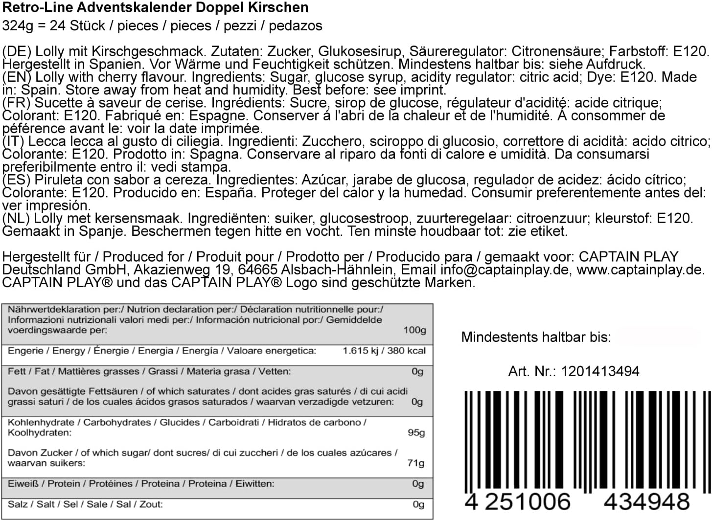 - enthält 24 Kirsch Lutscher einzeln verpackt, insgesamt 324g frische Ware mit sehr langer Haltbarkeit - die Adventskalender Füllung bietet keine Abwechslung, sondern jeden Tag den identischen Inhalt