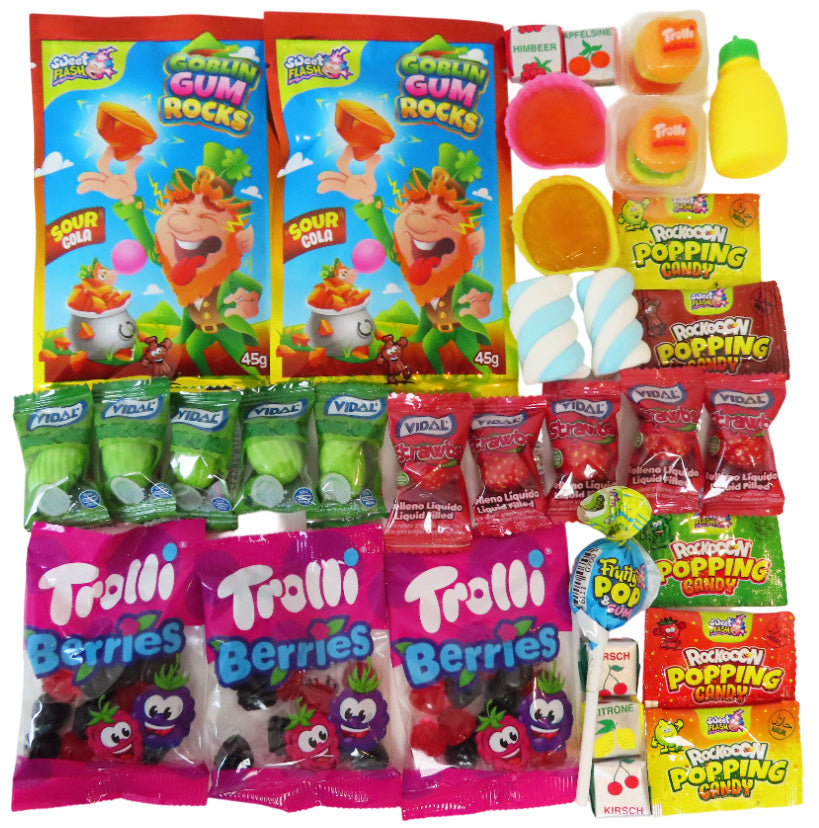 - mehr als 10 verschiedene Produkte enthalten - unkonventionelle und interessante Zusammenstellung aus Kaugummis, Brausen sowie süßen und sauren Zuckerwaren