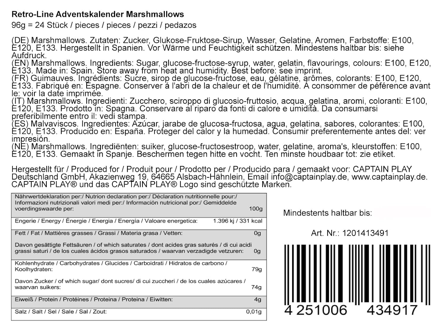 - Enthält 24 CAPTAIN PLAY Mini Marshmallows in Einzelverpackung, insgesamt 96g – jeden Tag derselbe süße Genuss - die Adventskalender Füllung bietet keine Abwechslung, sondern jeden Tag den identischen Inhalt