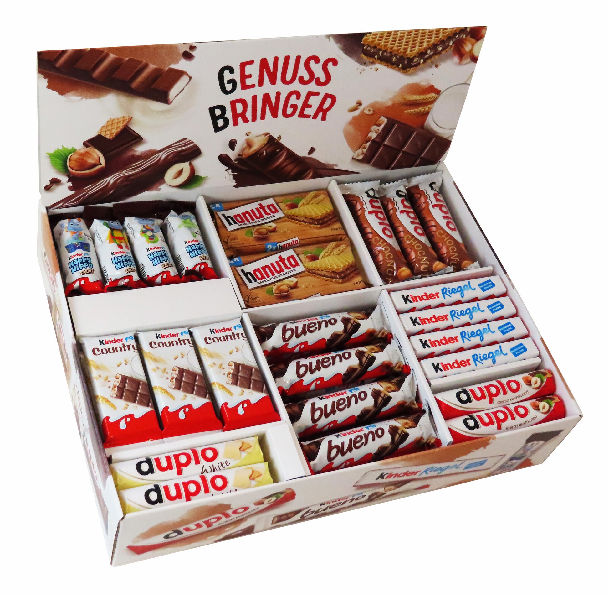 - beinhaltet 8 x Kinder Bueno Doppelriegel, 12 x Kinder Country, 16 x Kinder Riegel, 8 x Kinder Happy Hippo Snack, 12 x Duplo, 6 x Duplo Chocnut, 8 x Duplo White und 8 Hanuta Doppelpack