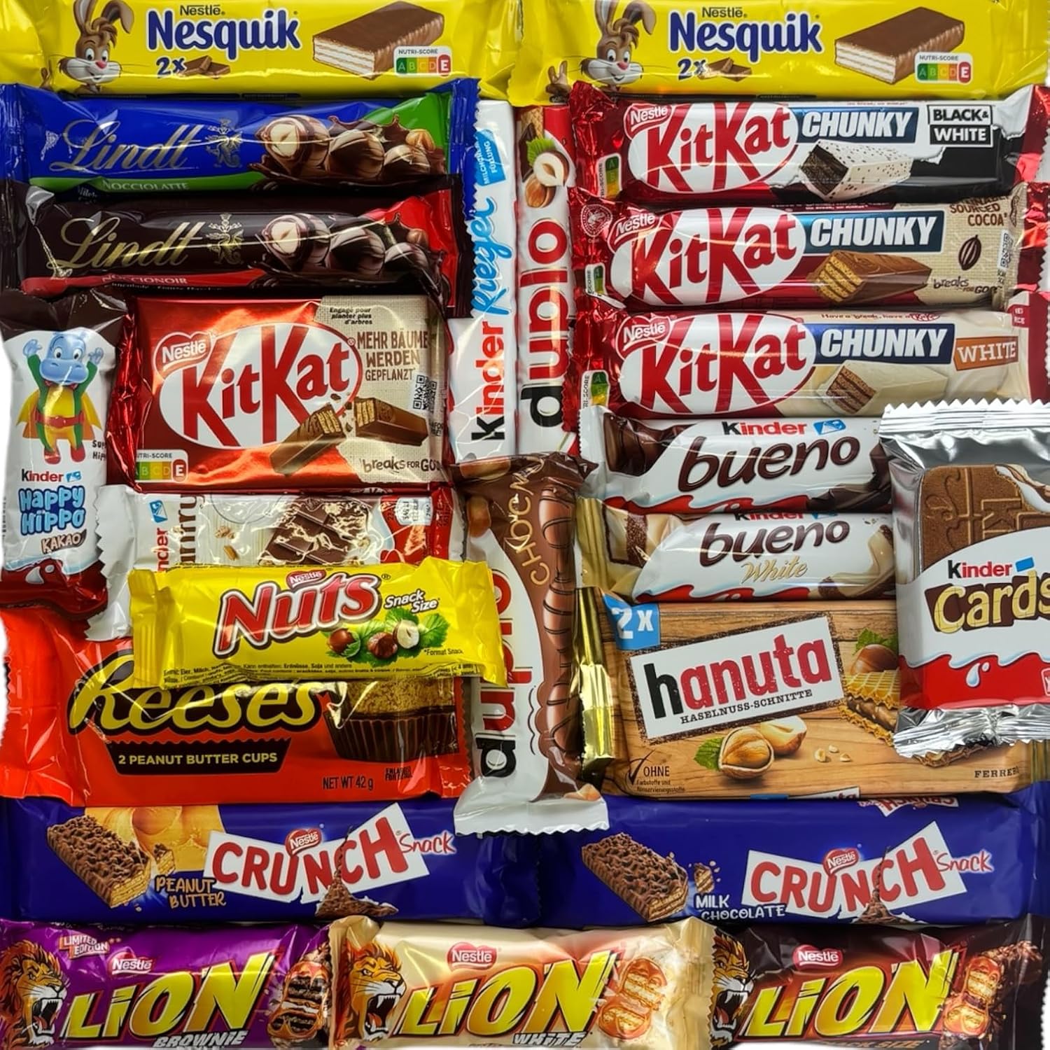 - unkonventionelle und interessante Zusammenstellung mit Produkten von Ferrero, Nestlé, Mars, Milka und Storck - darunter auch ausgefallene Snacks wie Nutella Bready, Cadbury Wunderbar und Knoppers Nuss Riegel sowie bekannte Klassiker wie Snickers, Kinder Riegel und Duplo