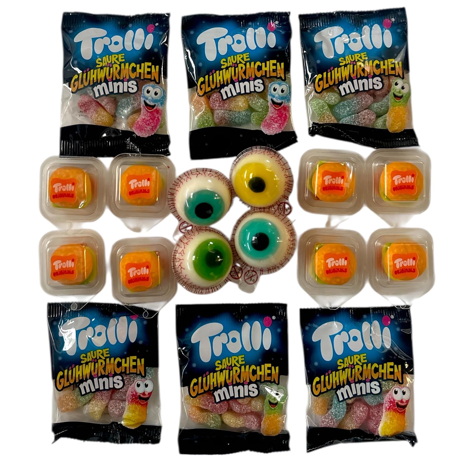 - beinhaltet 6 Mini Beutelchen Trolli Saure Glühwürmchen, 8 Trolli Mini Burger und 4 Trolli Glotzer - alle Teile einzeln verpackt, insgesamt 275g